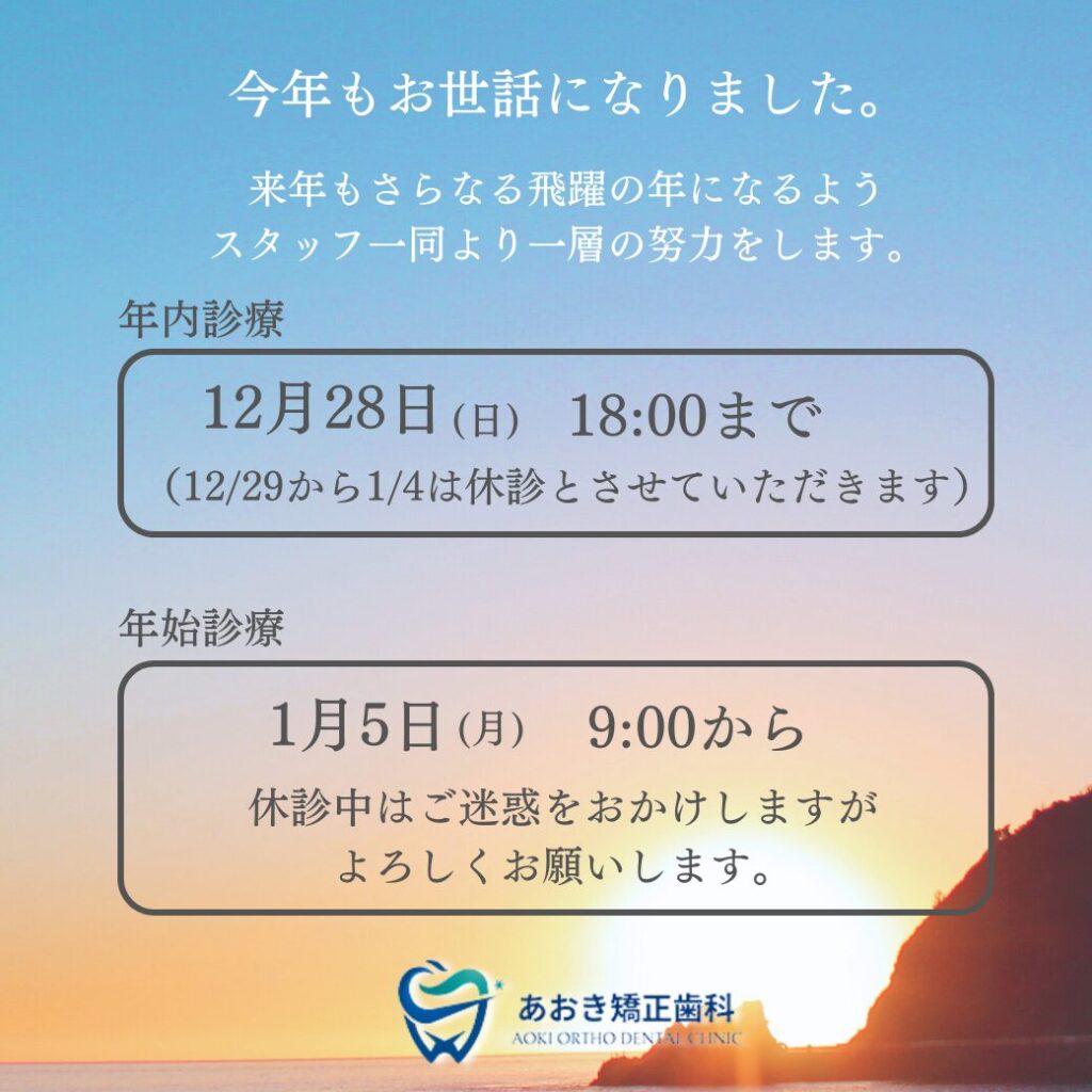 年内の診療は12月28日(日)18時までとなります。12月29日(月)〜1月4日(日)は休診となります。新年は1月4日(月)9時より診療致します。よろしくお願いいたします。
